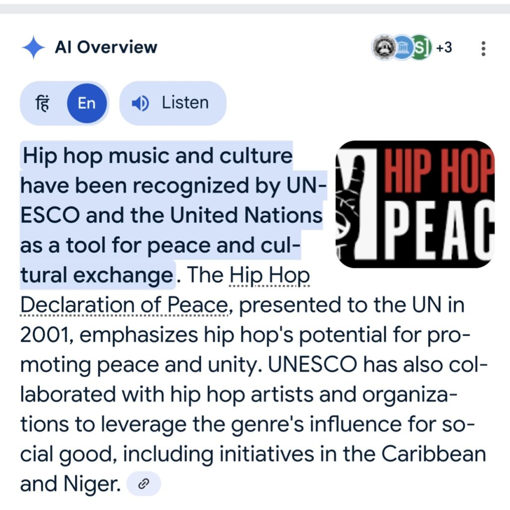 Regardless of how the media inaccurately portrays Hip Hop for defamation, political gains, and/or racial discriminations, Hip Hop is officially classified and recognized by both the UN (United Nations) and UNESCO as a movement and cultural heritage of Peace.